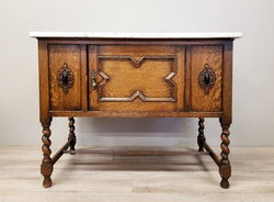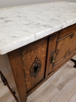 This early 1900's Welsh solid quarter sawn oak piece with barley twist legs has what it takes to evolve into a true stunner. Original finish is in excellent condition and will be delicately restored and further protected. The 2cm Carrara marble top can be restored and resurfaced or we can curate the perfect piece of 3cm material, perhaps a varietal of locally quarried Vermont Danby. Height can be modified for any plumbing plan.